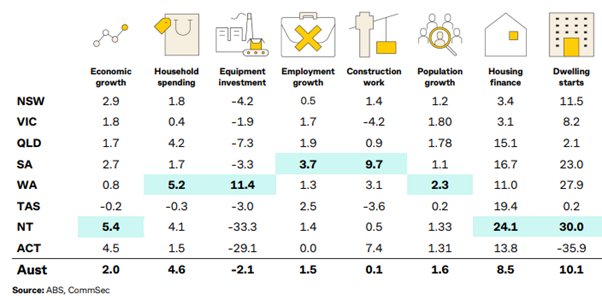 Overall, the economic performance of Australia’s states and territories is being supported by a combination of slowing inflation, falling interest rates, rising real wages, robust government spending and a solid labour market.