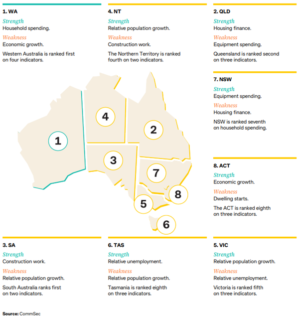 Just as the Reserve Bank uses long-term averages to determine the level of “normal” interest rates; CommSec have done the same with the economic indicators. For each state and territory, latest readings for the key indicators were compared with decade averages – that is, against the “normal” performance.