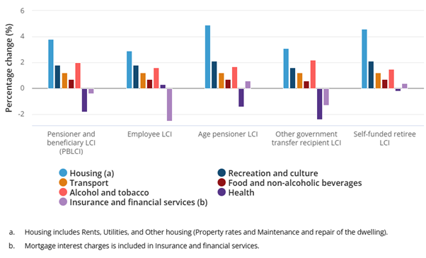 Housing and Recreation and culture were the main contributors to the rises in living costs across most household types this quarter. Rises in Transport, Food and non-alcoholic beverages and Alcohol and tobacco also contributed to increases in living costs. The main offsetting contributors were Health and Insurance and financial services, which fell for most LCIs.