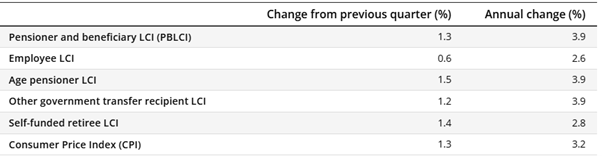 Living costs for Age pensioner (+1.5%) and other government transfer recipient (+1.2%) households and the Pensioner and Beneficiary LCI (PBLCI) (+1.3%) rose this quarter. Households represented by these indexes source their principal income from government payments.
